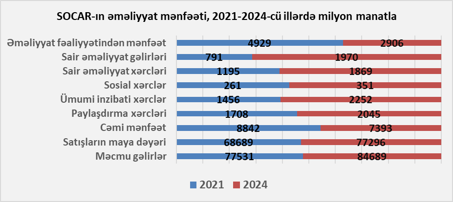 Bütün bu məlumatlardan daha çox şirkətin maliyyə nəticələrini əks etdirən ən mühüm göstəricinin – əldə olunan mənfəətin məbləğinin necə dəyişməsi dəyişikliklırin təsirini qiymətləndirmək üçün ən bariz indikator hesab edilə bilər. Maliyyə hesabatlarının analizi göstərir ki, istənilən şirkət kimi SOCAR-ın əsas fəaliyyətinin (hasilat və emal) real effektivliyini nümayiş etdirən əməliyyat mənfəəti 2024-cü ildə 3 il əvvəllə müqayisədə xeyli azalıb.