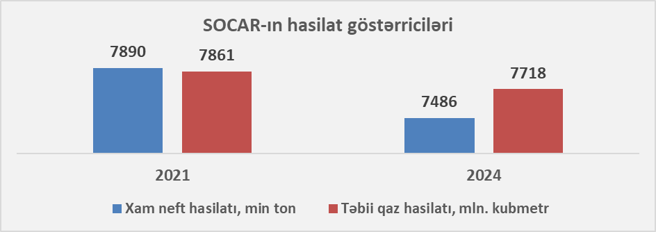 Son 3 ildə İqtisadi göstəricilərin (hasilat) müqayisəsinə gəldikdə, 2021-ci illə müqayisədə 2024-cü ildə neft hasilatı təxminən 400 min ton (5%) azalaraq 7,5 milyon tona, qaz hasilatı isə 143 milyon kubmetr azalaraq 7,7 milyard kubmetrə enib.
